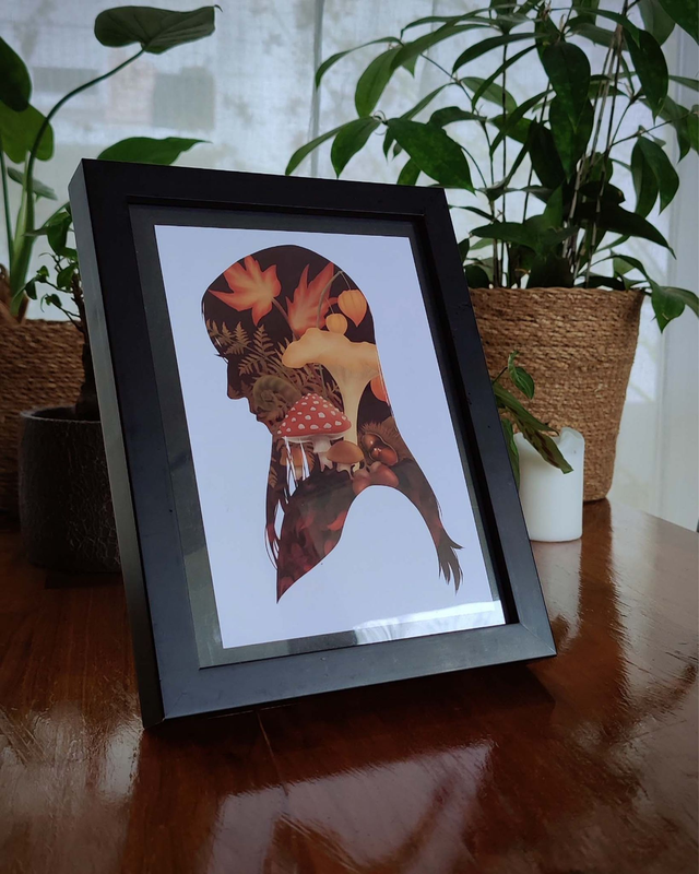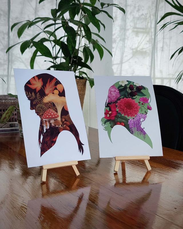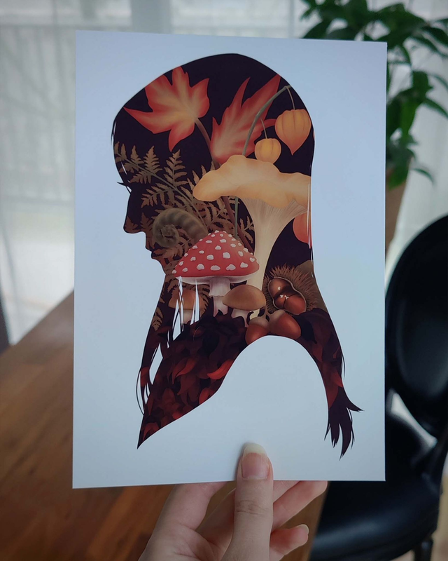 Ceci est un bouquet inspiré de plantes et fleurs qui poussent en automne, contenu dans un portrait en silhouette dessiné spécialement pour la personne de votre choix !