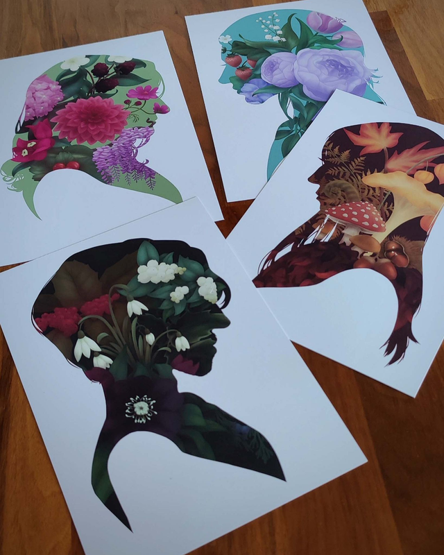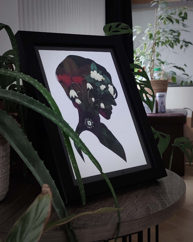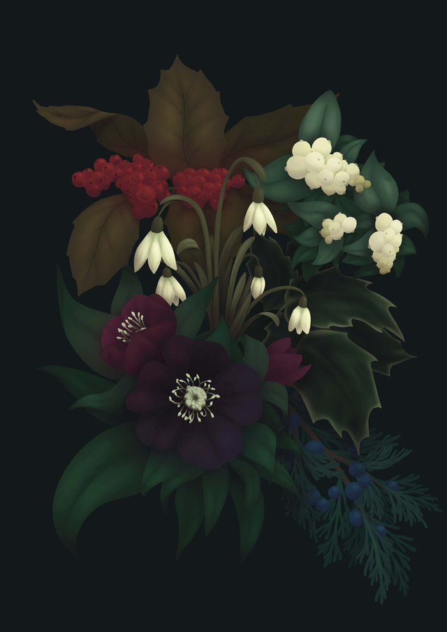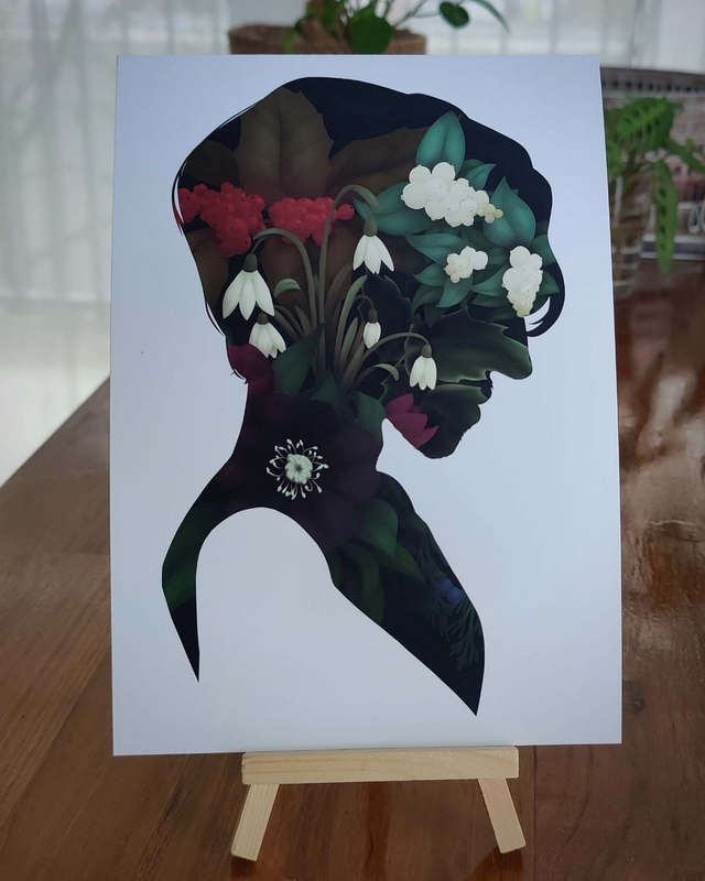Ceci est un bouquet inspiré de plantes et fleurs qui poussent en hiver, contenu dans un portrait en silhouette dessiné spécialement pour la personne de votre choix !