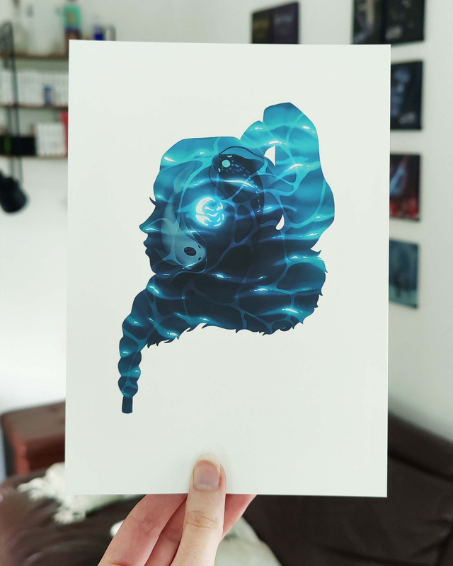 Illustration en silhouette de profil du personnage de Yue dans l'univers d'Avatar, symbolisé par l'élément de l'eau et les esprits de la lune et de l'océan.
