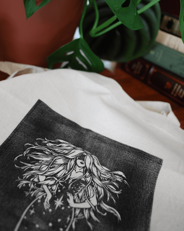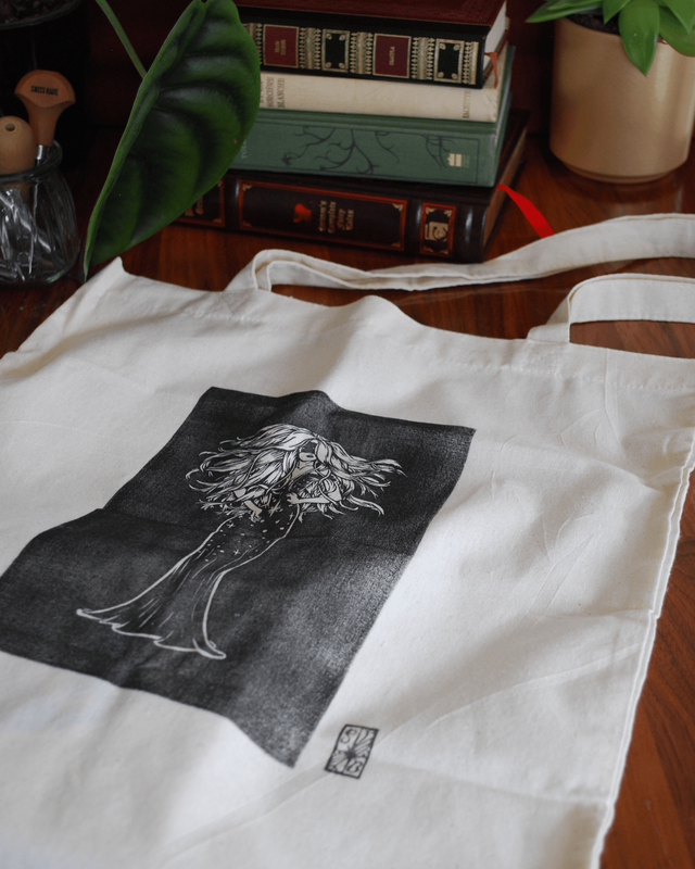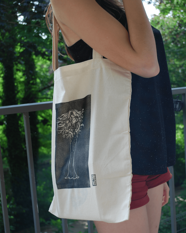 Impression en linogravure réalisée à la main sur un tote bag 100% coton